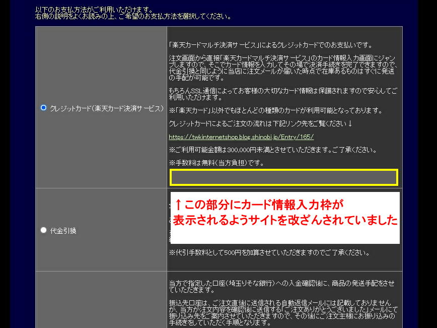 もしカード情報入力枠があってもそれは第三者による改ざんですので、絶対にカード情報を入力しないでください。